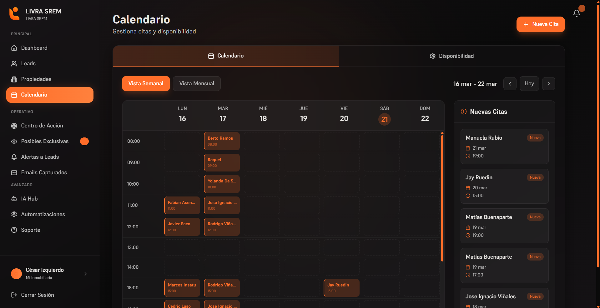 Tus agentes marcan disponibilidad, los leads eligen hueco y Livra gestiona recordatorios automáticos 24h y 2h antes para ambas partes. Cero cancelaciones de última hora.