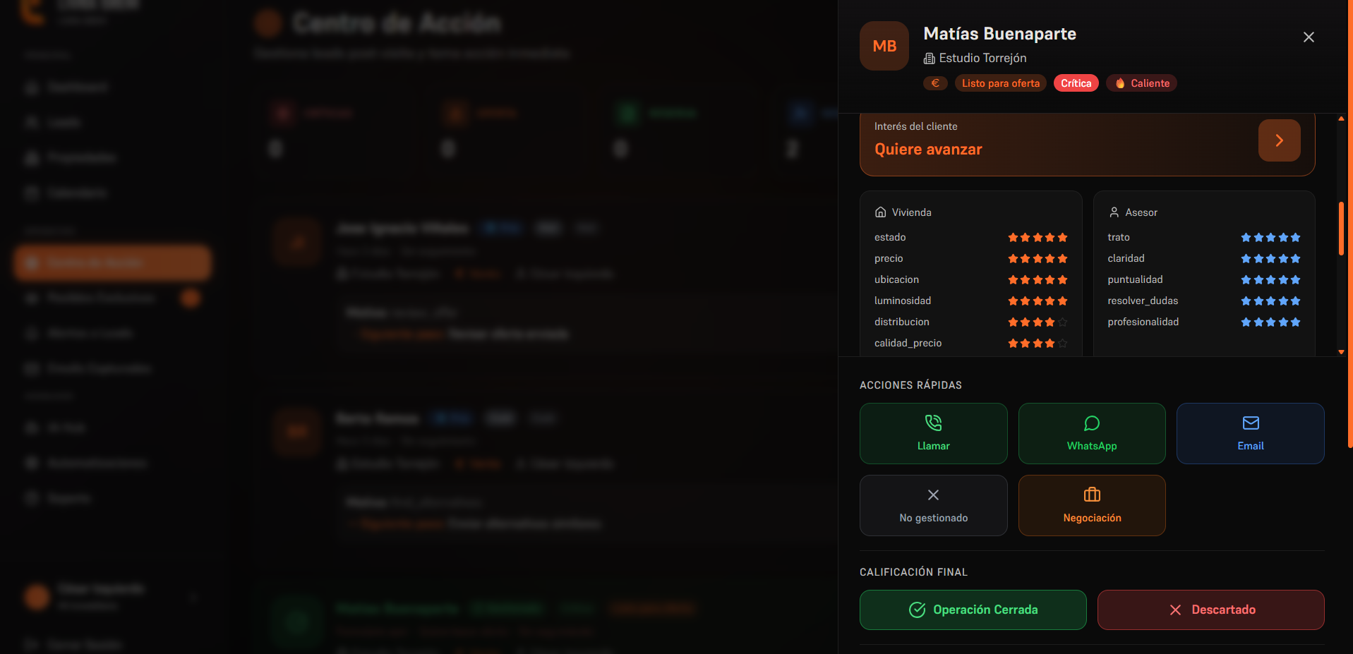 "El matching inteligente es una pasada. Me avisa cuando un lead nuevo encaja con un piso que lleva semanas sin visitas. Hemos cerrado 4 operaciones así."