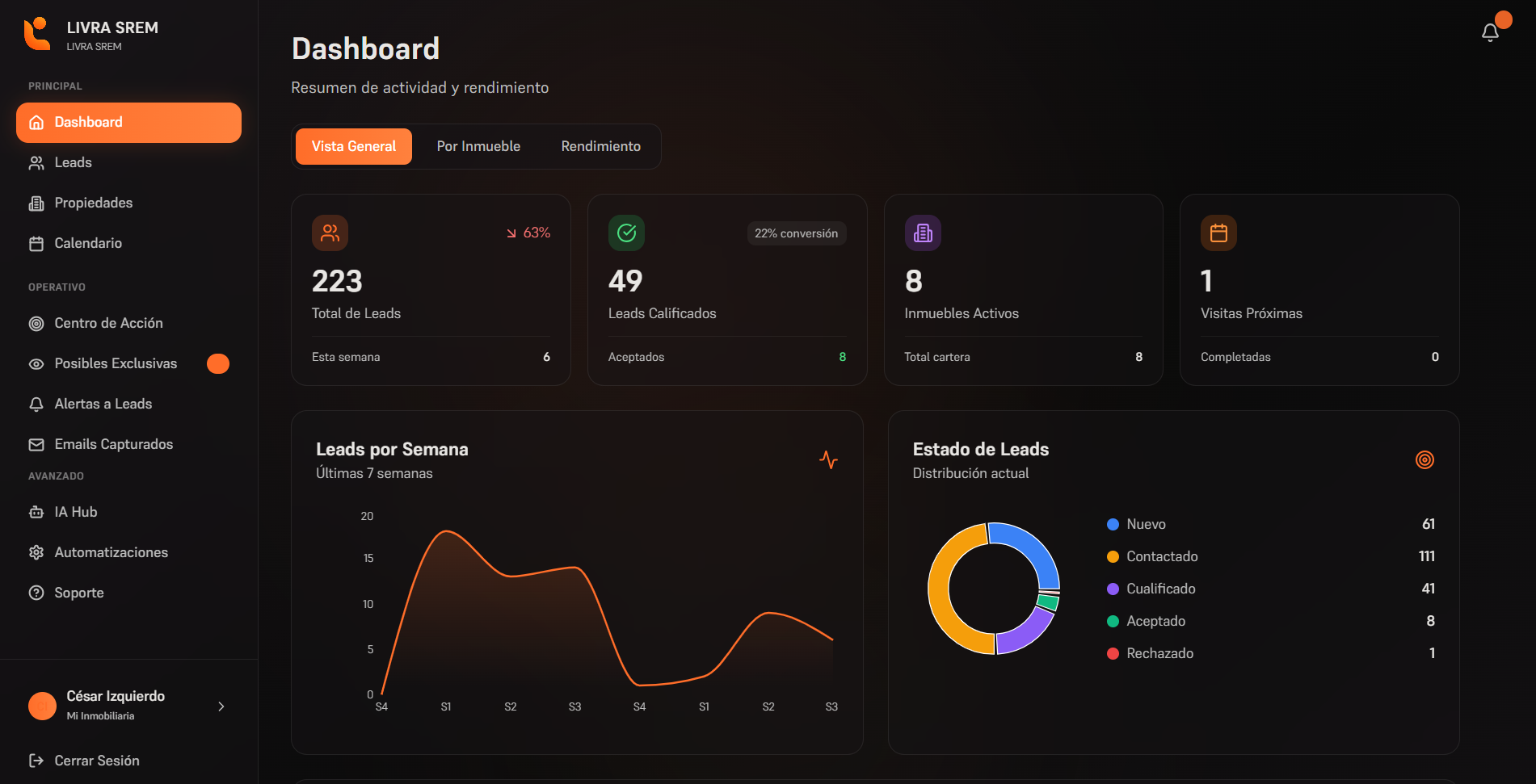 Seguimientos automáticos, recordatorios de visita y matching inteligente lead–propiedad. El SREM que trabaja mientras tú estás en la calle.