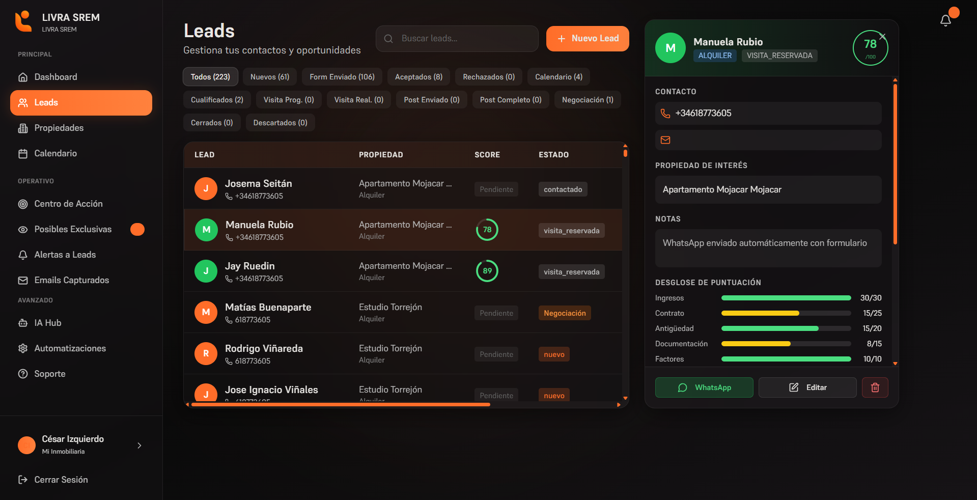 "Desde que usamos Livra no hemos perdido un solo lead de Idealista. La automatización de WhatsApp nos ahorra unas 3 horas al día."